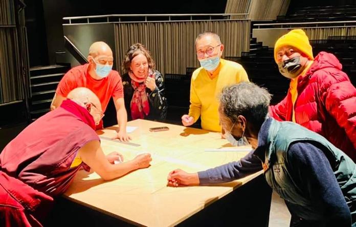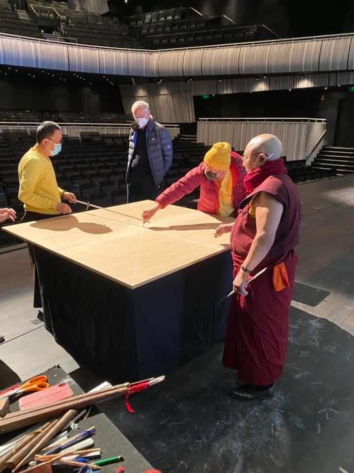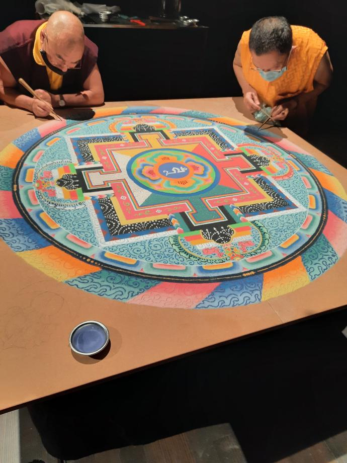 Avec une extrême précision et concentration, Lama Karnyima, Lama Seunam, Tempa Rugbay et Lama Zeupa forment pendant deux jours un mandala de sable, représentation symbolique d'un monde pur, en utilisant un chak-pur, un petit outil en forme d'entonnoir, du sable mélangé à colorants naturels à déposer dans le sable.
