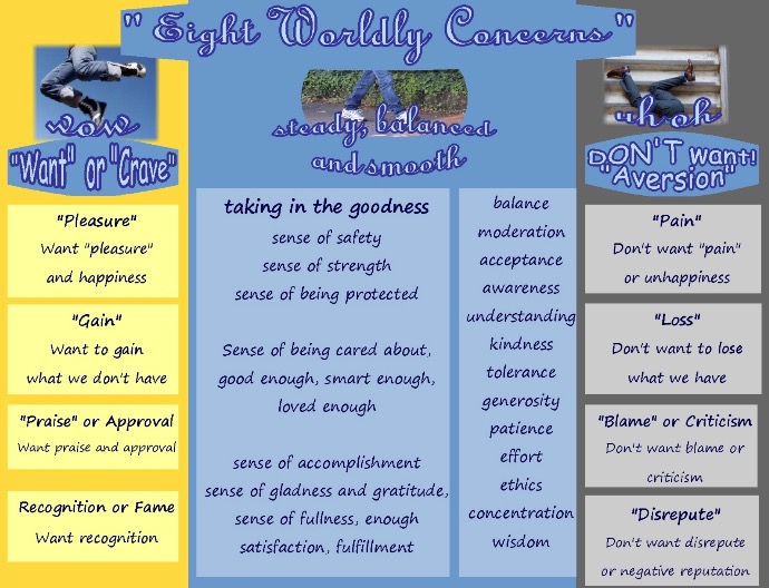 Cette compréhension est un impératif pour tout individu aspirant à progresser sur le chemin bouddhiste. Ces 8 dharmas mondains font référence à des désirs et des expériences auxquels chacun d'entre nous est confronté dans la vie quotidienne.